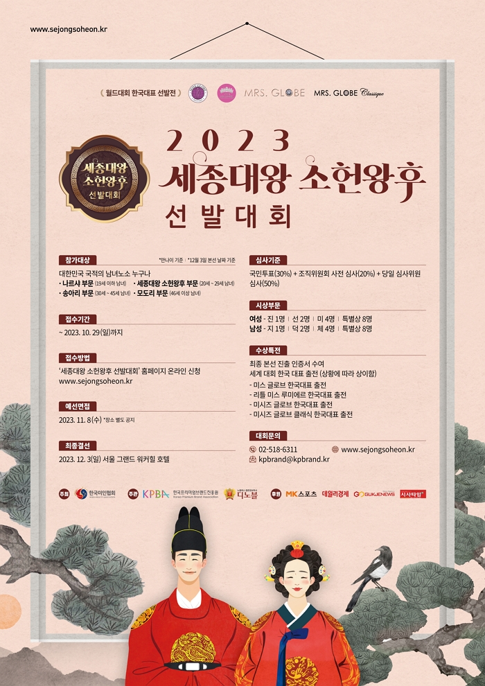 본 대회 수상자들은 대한민국의 홍보대사로서 한글의 우수성과 한복의 아름다움, 그리고 한식의 세계화 및 한류 문화를 전세계에 알릴 세종대왕과 소헌왕후를 선발하는 대한민국 최고의 한복모델 선발대회입니다.